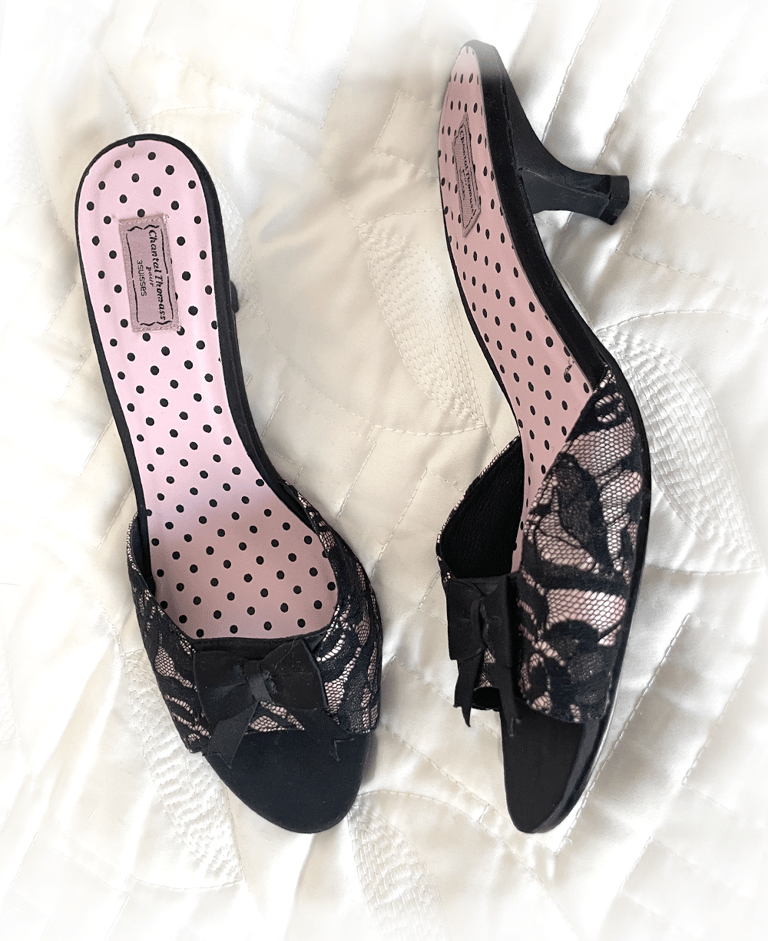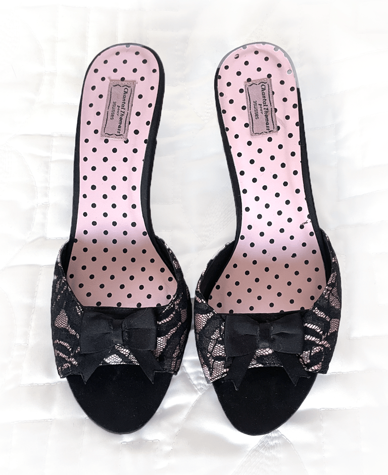 Chantal Thomass pour 3 suisses kitten heels mules, size 39, pink and black with lace and little bows details